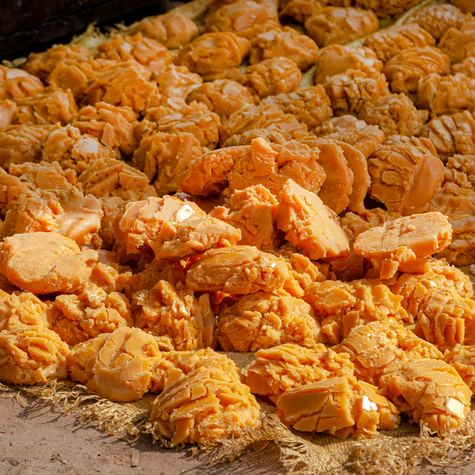 Jaggery is a traditional, unrefined natural sweetener made primarily from sugarcane juice or palm sap. Unlike refined white sugar, jaggery retains essential minerals and vitamins because it undergoes minimal processing. It has a rich golden to dark brown color, a distinct caramel-like flavor, and is widely used in household cooking, confectionery, beverages, and traditional sweets across many cultures.